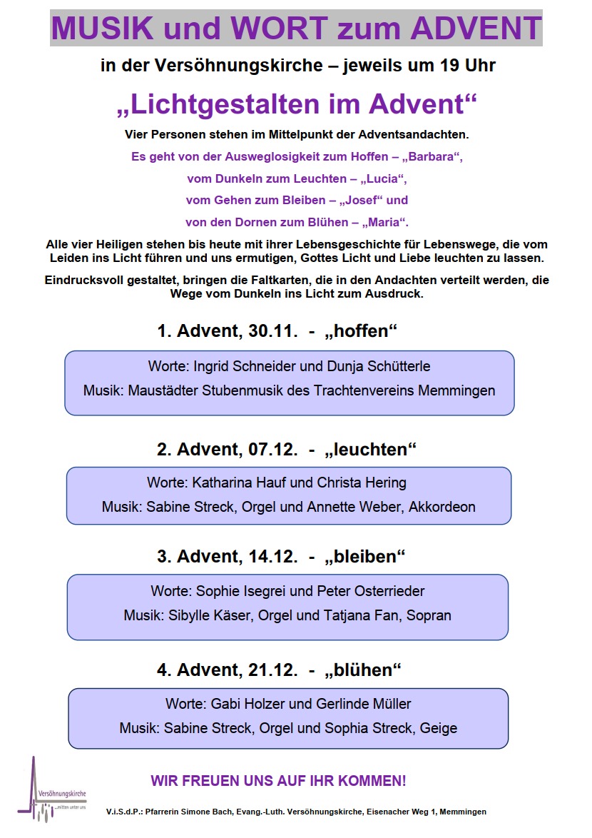 Wie alle Gemeinden der Evang.-Luth. Landeskirche in Bayern (ELKB) folgen auch wir der Aktion "Aktiv gegen Missbrauch". Bereit seit einigen Monaten erarbeitet der Kirchenvorstand ein Schutzkonzept zur Prävention sexualisierter Gewalt. Informationen über die Aktion und das Schutzkonzept finden Sie in Kürze auch auf unserer Webseite.